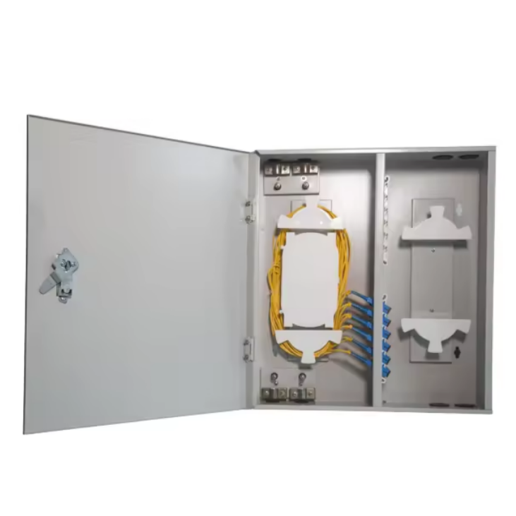 This 24 Port Wall mount Fiber Termination Box is designed for 24 sc fiber pigtails splicing with drop cable, Easy to install and coming with locks for protection.